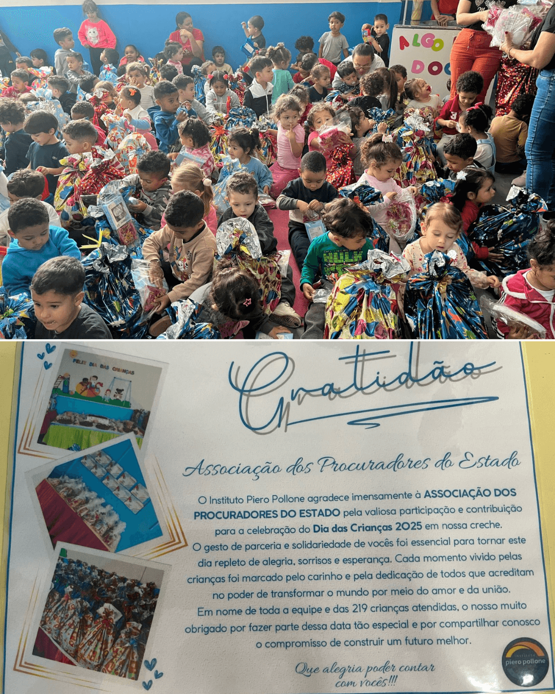 “Novamente, os Procuradores do Estado de São Paulo proporcionaram um momento inesquecível para as crianças da Creche da IALP. Mais do que os presentes, foi uma entrega de amor e acolhimento. Agradecemos muito a Diretoria da APESP por essa valiosa colaboração”, registra o associado Marcelo de Aquino.