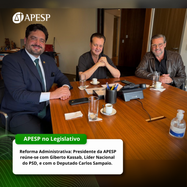O Presidente da APESP, José Luiz Souza de Moraes, reuniu-se na manhã de hoje (20), com o Presidente Nacional do PSD e Secretário de Governo e Relações Institucionais de SP, Gilberto Kassab, e o Deputado Federal Carlos Sampaio (PSD-SP).
