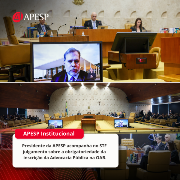 O Presidente da APESP, José Luiz Souza de Moraes, acompanhou ontem (6), direto do Plenário do STF, o julgamento do Recurso Extraordinário n.º 609.517/RO, que trata da obrigatoriedade de inscrição na OAB para o exercício da Advocacia Pública.