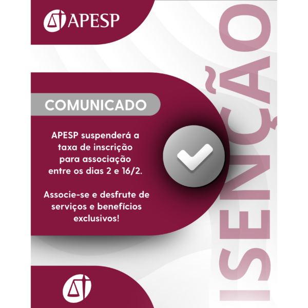 Os colegas que desejarem se associar à APESP estarão isentos do pagamento da taxa de inscrição entre os dias 2 e 16 de fevereiro (prazo de 15 dias). A decisão ocorreu por meio de uma deliberação da Diretoria da Associação.