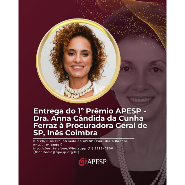 No próximo dia 20 de março (sexta-feira), às 15h, na sede da Associação (Rua Líbero Badaró, nº 377, 9º andar), a APESP realizará uma solenidade para conceder o 1º Prêmio “APESP – Dra. Anna Cândida da Cunha Ferraz” em homenagem à atual Procuradora Geral do Estado de São Paulo, Inês Coimbra.